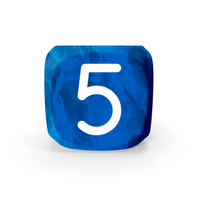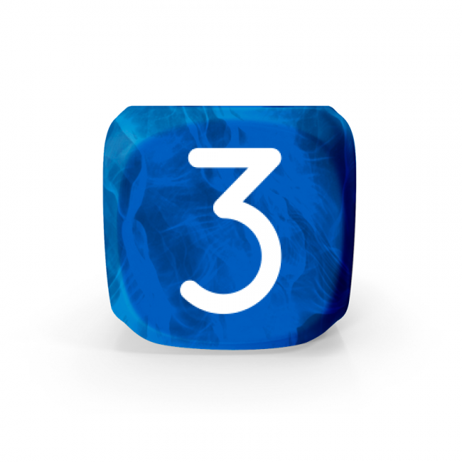 - Peculiaridades en los detalles: Es posible que se presenten ligeras variaciones en los puntos numéricos, grabados o en la pintura final de los detalles de los dados. Algunas variaciones mínimas pueden surgir debido a la manipulación durante el proceso de personalización. También puede observarse un halo, efecto difuminado o rebabas alrededor del grabado (ya sea logotipo, puntos, números o iconos) causado por el calor del láser al interactuar con ciertos materiales del dado. Adicionalmente, pueden aparecer pequeños roces o ralladuras, especialmente visibles en dados con efecto gema, debido a su acabado más brillante y translúcido. La pintura aplicada en los grabados puede presentar desvanecimientos según el color base del dado, y es posible que se observe falta de cobertura, en especial en colores de pintura de tonalidades claras como amarillos, amarillo verdoso o naranjas. En algunos casos, pueden producirse cambios en la disposición de números, logotipos, iconos o textos, que pueden diferir de lo mostrado en el personalizador, debido a ajustes técnicos necesarios en el proceso de producción.