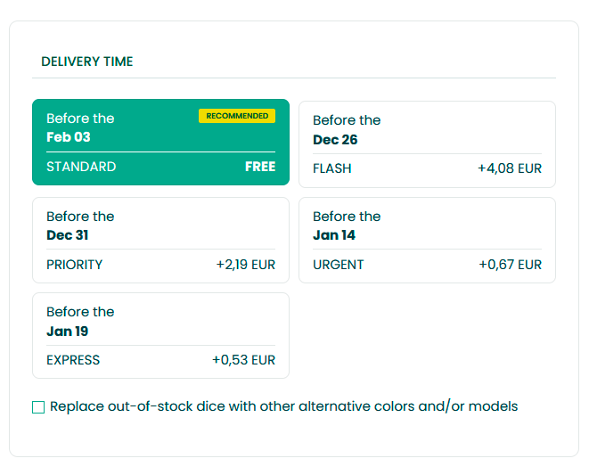 Si no puedes esperar a tener tus dados en el plazo de producción que has seleccionado puedes cambiar el tiempo de producción por uno más rápido. Este proceso conllevará costes adicionales.